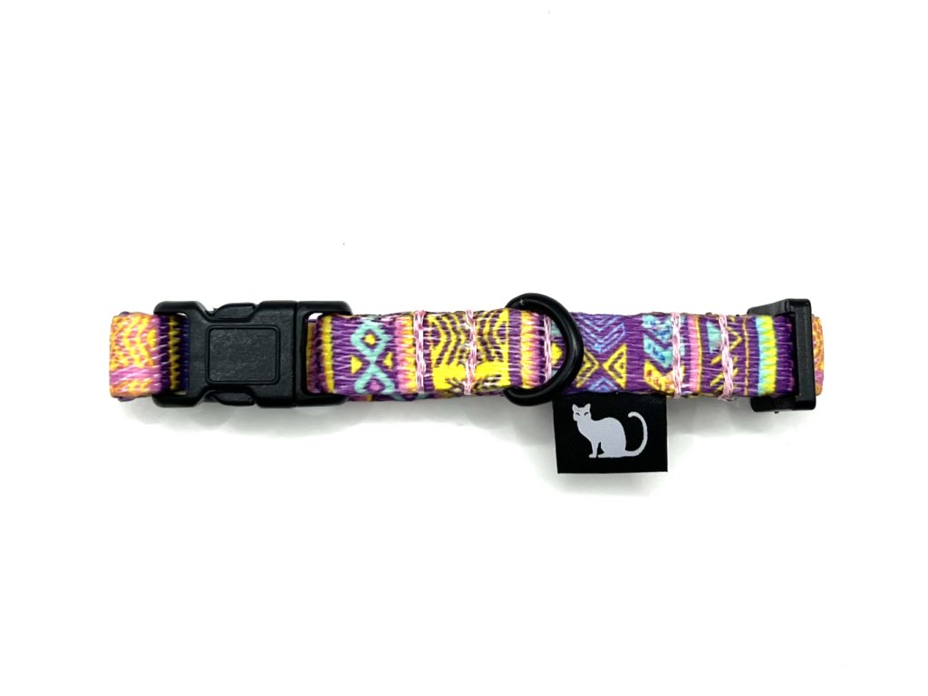 Obojek pro kočky z PES popruhu šířky 1 cm. Obojek má speciální bezpečnostní karabinu, která se díky rychlému uvolňovacímu mechanismu při tahu 2–3 kg samovolně rozepne a zabrání tak zranění zvířete.
