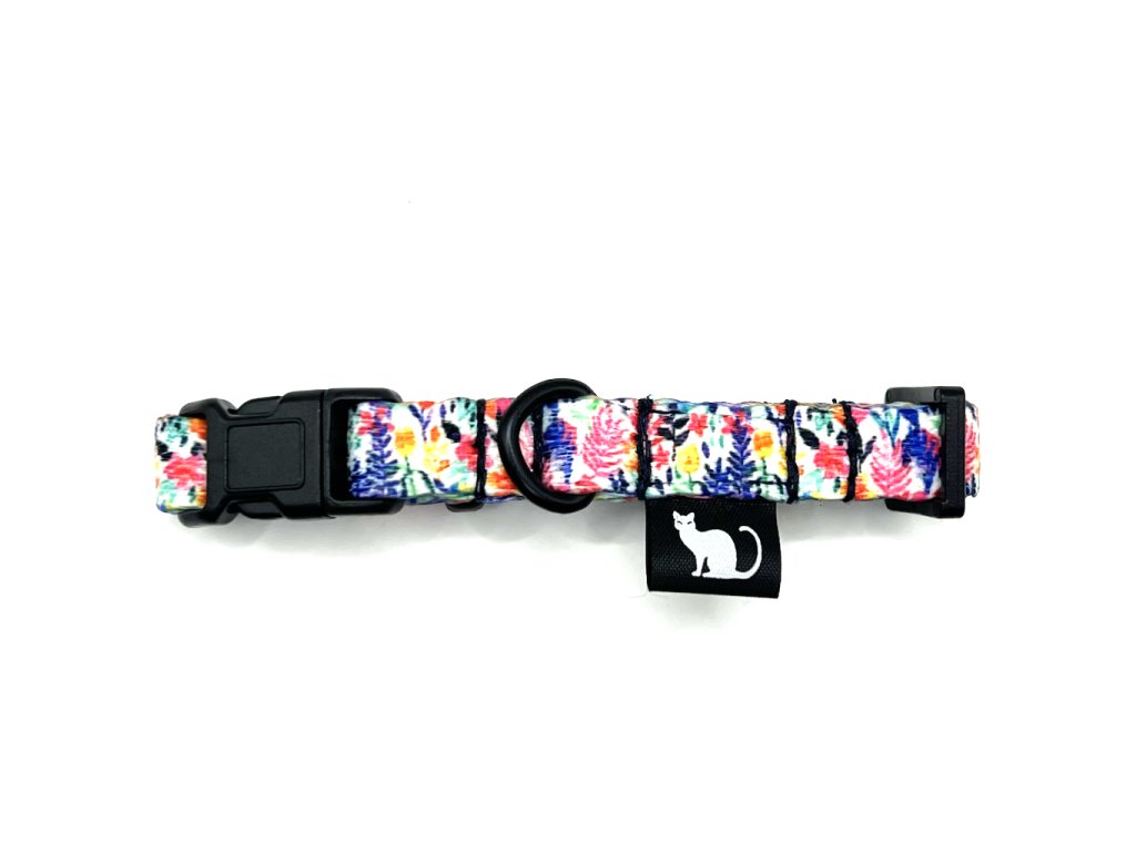Obojek pro kočky z PES popruhu šířky 1 cm. Obojek má speciální bezpečnostní karabinu, která se díky rychlému uvolňovacímu mechanismu při tahu 2–3 kg samovolně rozepne a zabrání tak zranění zvířete.