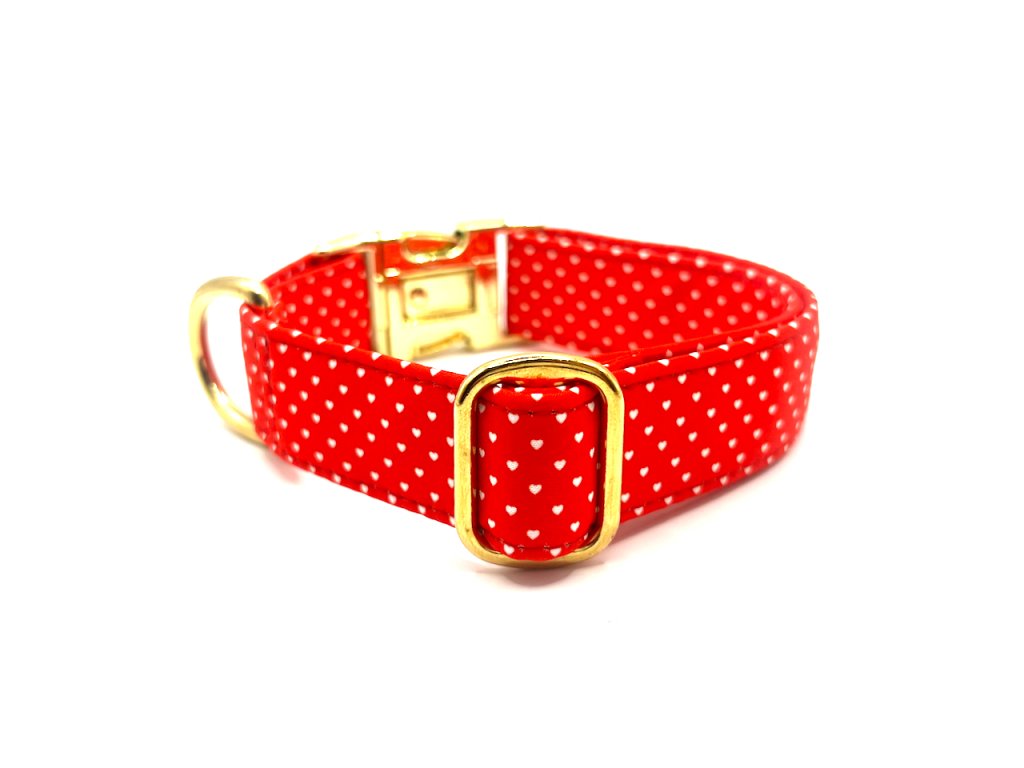 Obojek s motivem mini srdíček na červeném podkladu je krásným motivem jak pro psí slečny tak i pro psí elegány.