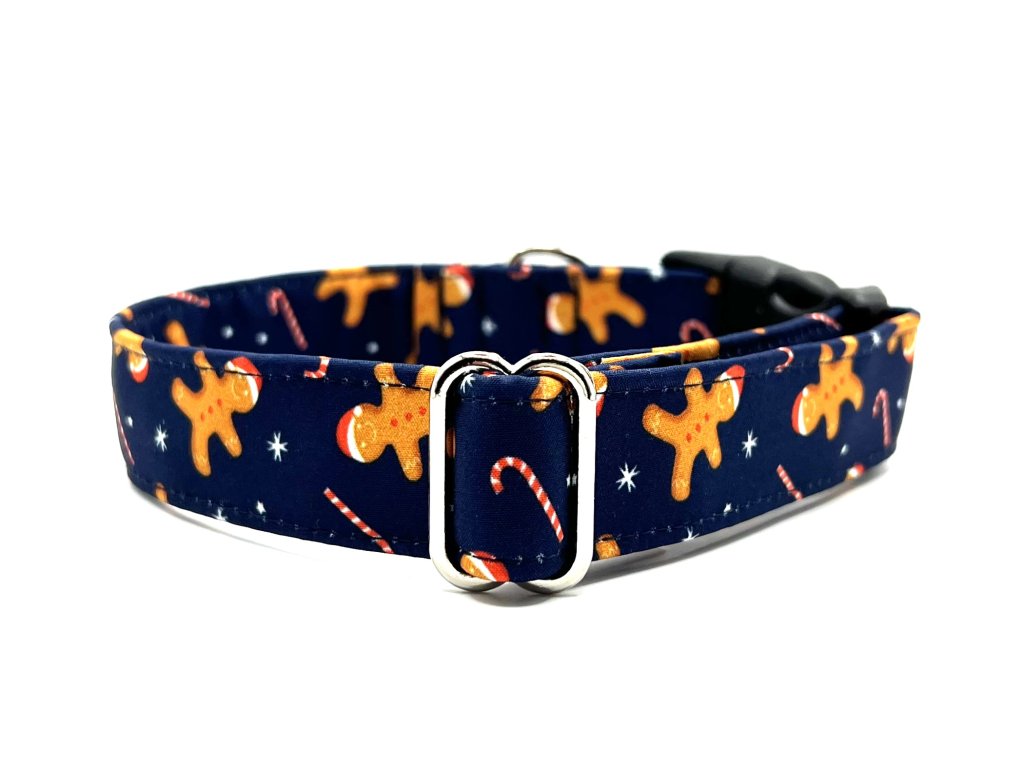 Obojek s motivem perníčků s roztomilou čepičkou na tmavě modrém podkladu je vhodný pro všechna psí plemena. Je vyroben ze speciální látky s membránou, která odpuzuje vodu a nečistoty. Tento originální obojek ocení majitelé, kteří nechtějí splývat s davem.