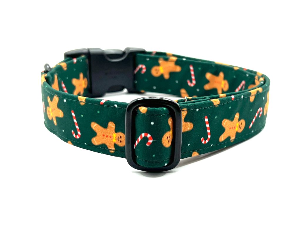 Obojek s motivem perníčků na tmavě zeleném podkladu je velmi oblíbeným vánočním vzorem a nesmí chybět na žádném vánočním focení:)