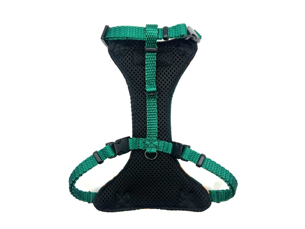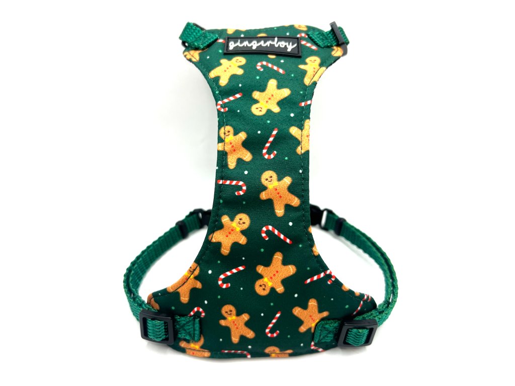 Postroj pro kočky s náprsenkou s vánočním motivem perníčků na tmavě zeleném podkladu a PP popruhu šířky 1 cm.