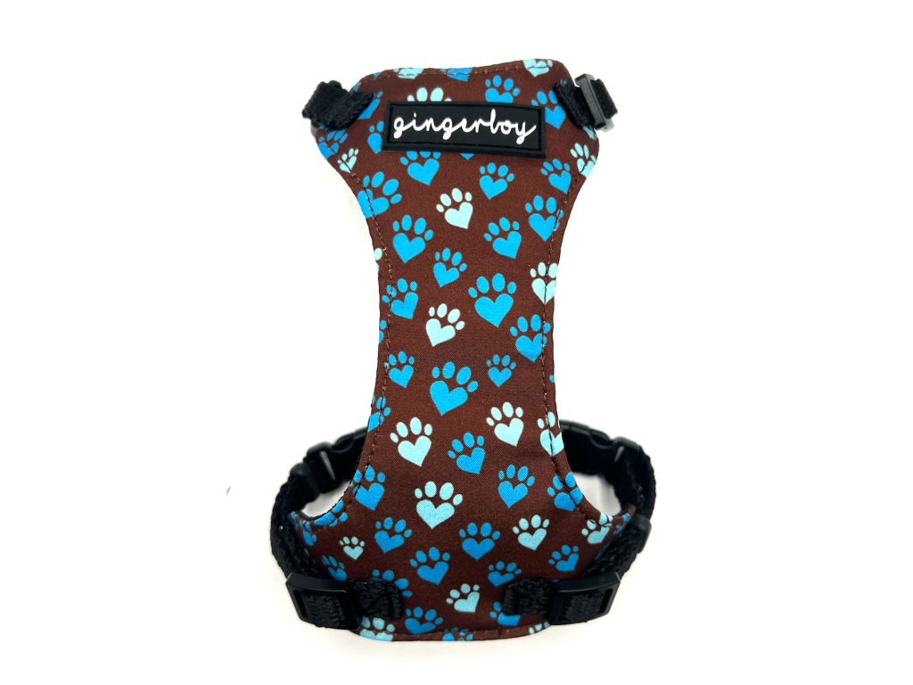 Postroj pro kočky s náprsenkou s tlapičkami ve tvaru srdíček a PP popruhu šířky 1 cm.