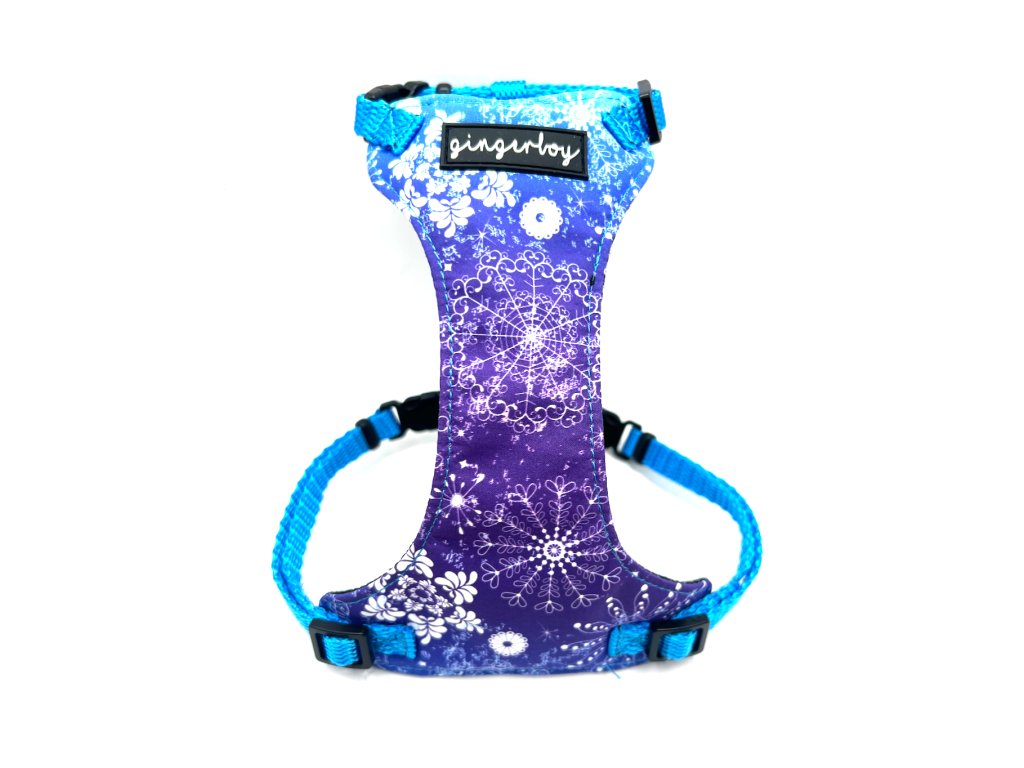 Postroj pro kočky s náprsenkou s krásným zimním motivem fialovou-modrých vloček a PP popruhu šířky 1 cm.