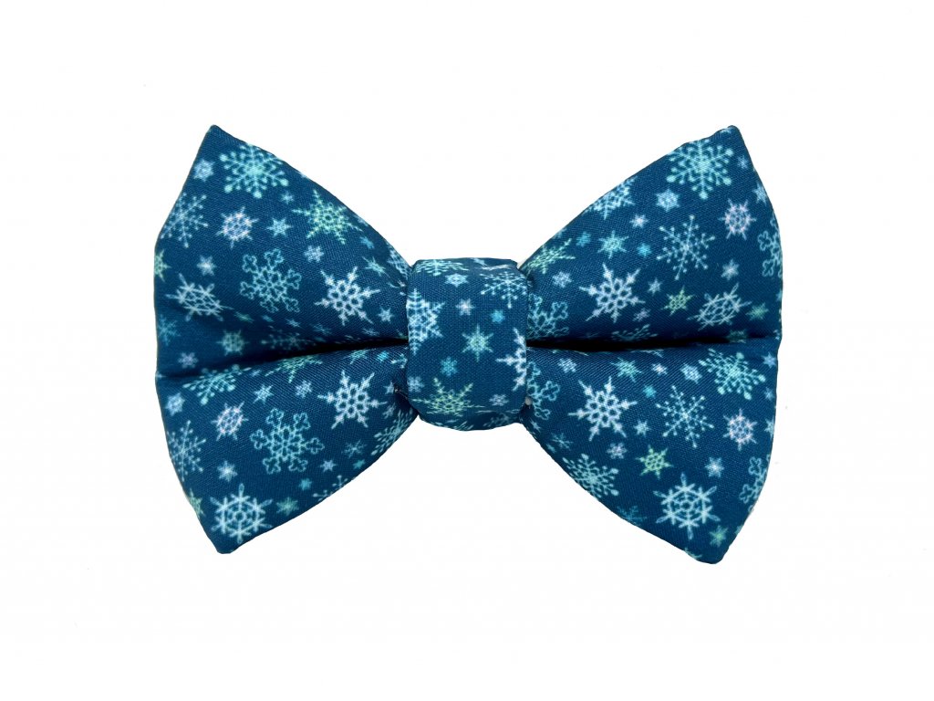 Veselý motýlek pro pejska s jedinečným vzorem vloček. Motýlek je vyrobený ze speciální látky, která odpuzuje vodu a nečistoty. Je vybaven suchým zipem, aby se dal lehce připnout na stávající obojek vašeho pejska.